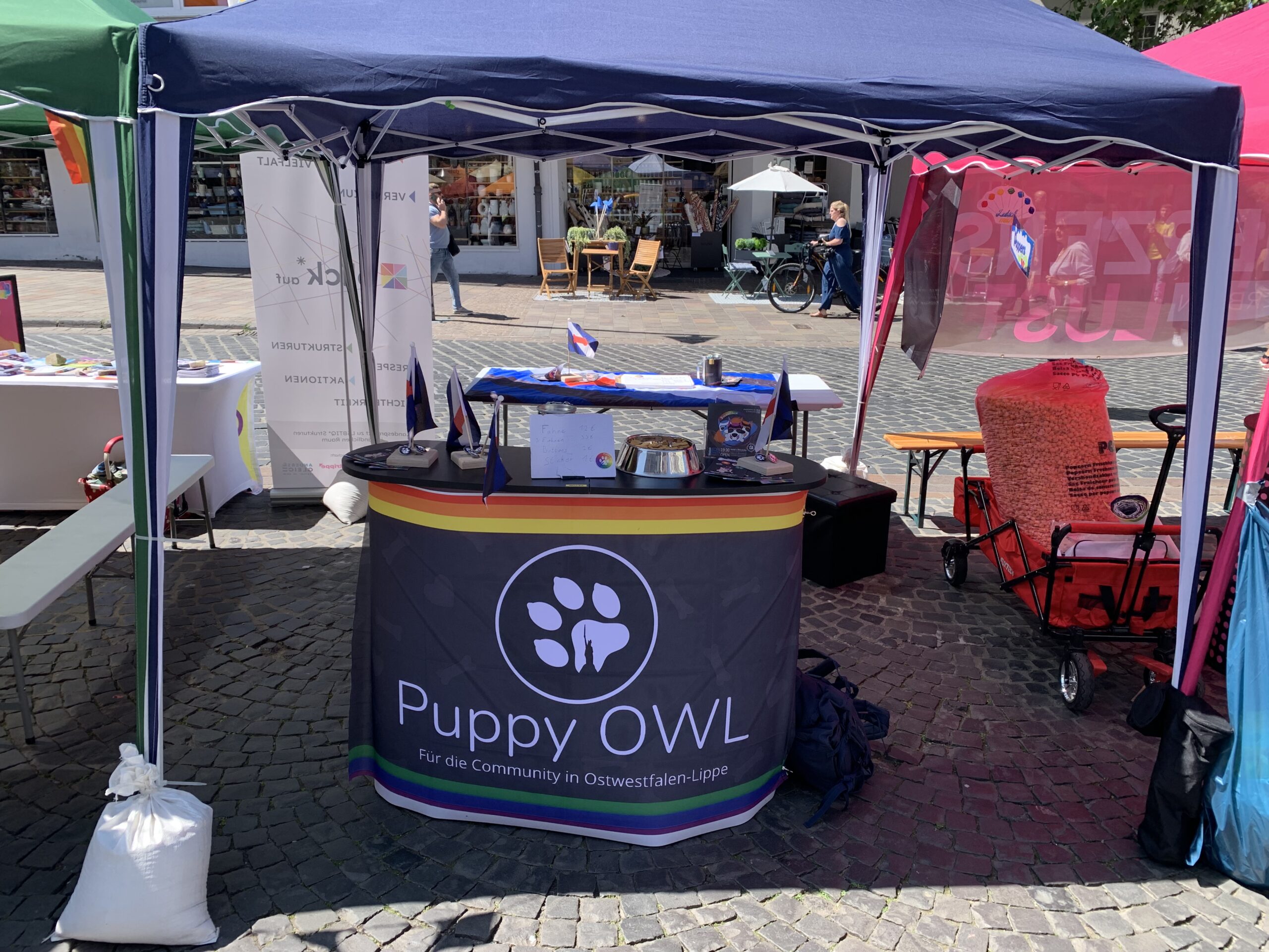 So kam es dazu das zum ersten mal bei einer CSD Demo im „tief schwarzem“ Paderborn Puppys von Puppy OWL mit liefen und ein Puppy Infostand gestellt wurde. Es wurden viele offene Fragen beantwortet und Einblicke ins Puppy Play gegeben. Natürlich durften Kekse an unserem Stand nicht fehlen.